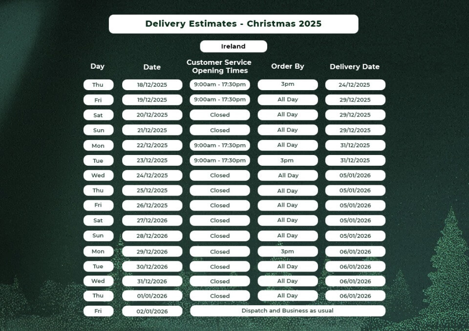 *Terms and conditions apply. Order must be placed before 3 pm on the 18th December to receive an order before Christmas. Any order placed on 18th December after 3pm won't be delivered until the 29th December or thereafter. For free super saver delivery, your order value must be over €99 (exVat) only applying to stock products.